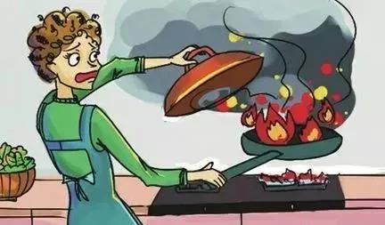 油鍋起火時,千萬不能用水澆。因為水遇到熱鍋形成“炸鍋”,使油火到處飛濺。