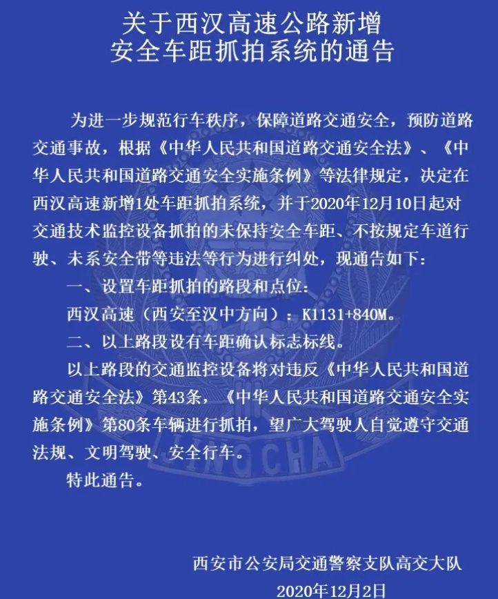 近日,西安高速交警官方微博發(fā)布了《關(guān)于西漢高速公路新增安全車距抓拍系統(tǒng)的通告》,表示將于12月10日起對交通技術(shù)監(jiān)控抓拍的未保持安全車距等違法行為進行處罰。