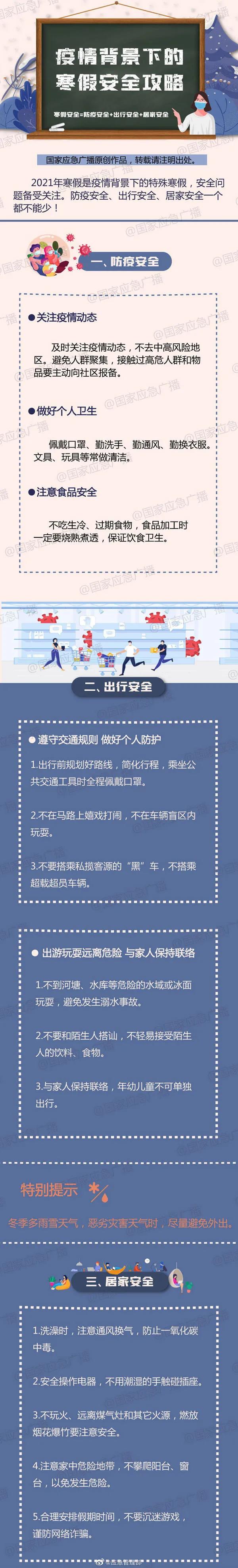 2021年寒假是疫情背景下的特殊寒假,安全問題備受關(guān)注。防疫安全、出行安全、居家安全一個(gè)都不能少!戳下圖了解↓不讓安全放假。